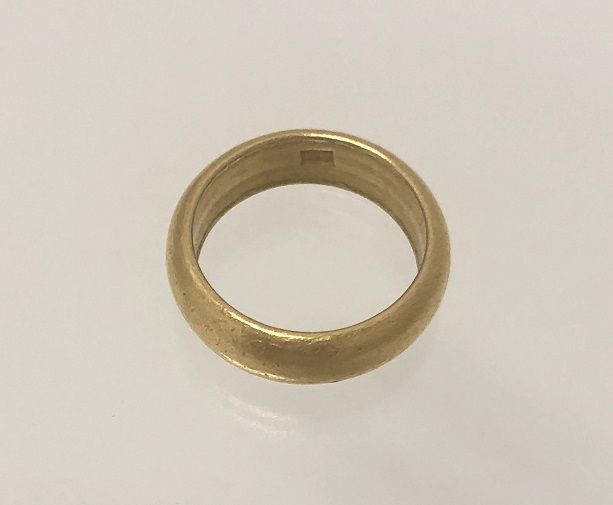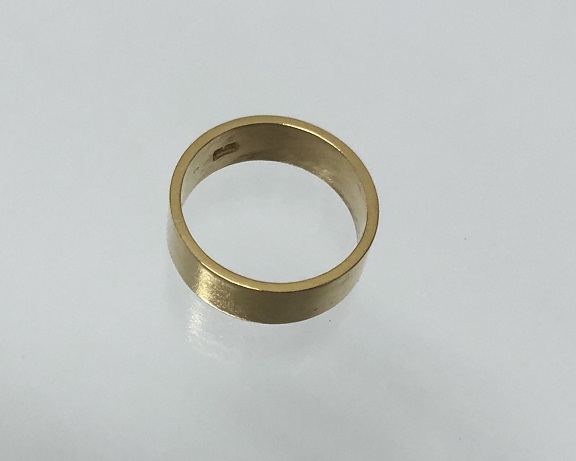 ご希望をお聞きすると、お母様がいつも着けていたこの甲丸リングの純金地金だけ使って幅6mm.、厚さ約1.00mm.、サイズ13番で平打リングにジュエリーリフォームしました。
