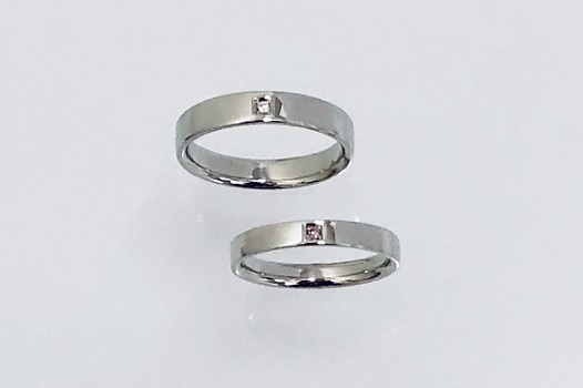ご希望を色々お聞きしてK様のリングは4㎜.幅の平打リングに、0.011ctホワイトダイヤモンドをセットしました。フィアンセのリングは3mm.幅の平打リングに、0.011ctピンクダイヤモンドをセットしました。