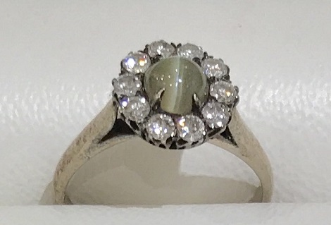 リングにセットしてある中央のキャッアイ効果の出る石は天然クリソベリルキャッアイで、取巻きのホワイト石も天然ダイヤモンドでした。