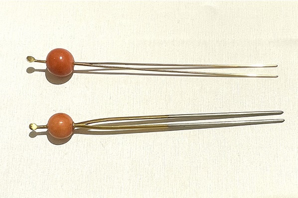 エックス線金属分析機でかんざし部分を調べると写真上の細い金属はK18でしたが下のかんざし部分は貴金属ではありませんでした。