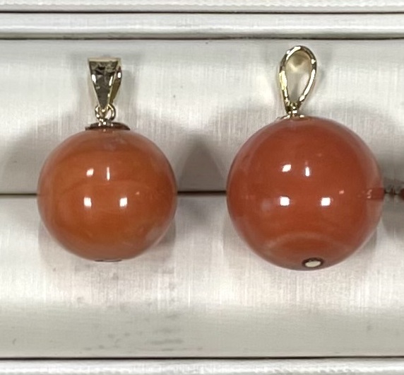 大きな球の2個のサンゴは直径は14.87㎜-14.97㎜と13.34㎜-13.45㎜です。