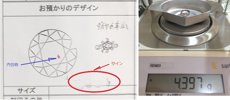 「お預かり書」にダイヤモンドのサイズの記載はもちろん、ダイヤモンドの重量と使用地金を刻印、お預かり商品のデザイン、ご希望のデザイン、お見積もりなどを記載し最も重要な部分ですが、顕微鏡で内包物をお客様ご自身に確認頂きサインをしてもらいます。
