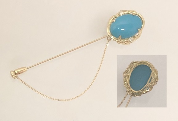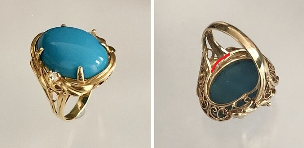 甦るオリジナルオーダーメイドジュエリーリフォームトルコ石のリングをお持ちななられたO様。リングを着用しなくなったのでピンブローチにジュエリーリフォームをご希望されました。リングをピンブローチにしたときの裏側リングのアームを切り取ると赤い線で示した部分が開いてしまい、強度が弱くなることと洋服を傷つけてしまいます。 リングからピンブローチに甦るジュエリーリフォーム そこで、写真のようにK18で橋渡しをして唐草で空間を飾りました。 掛った費用:¥52,000(税込)= 加工賃¥56,837(税込)ー¥4,837(2020年7月28日のアーム売却代)