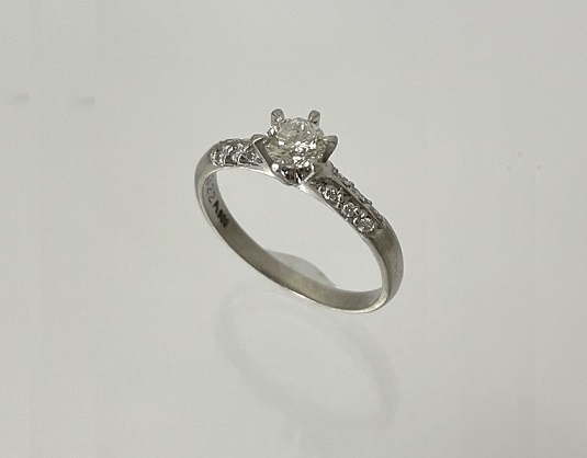 アームにメレ―ダイヤモンドが彫留された立爪の婚約指輪[/caption]