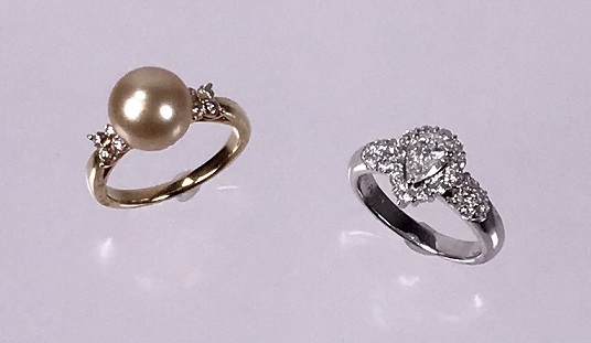 お持ちになられたのは全く違ったタイプのK18ゴールデン南洋真珠リングと、Pt900ペアシェープカットはセンターに入ったダイヤモンドリングです。